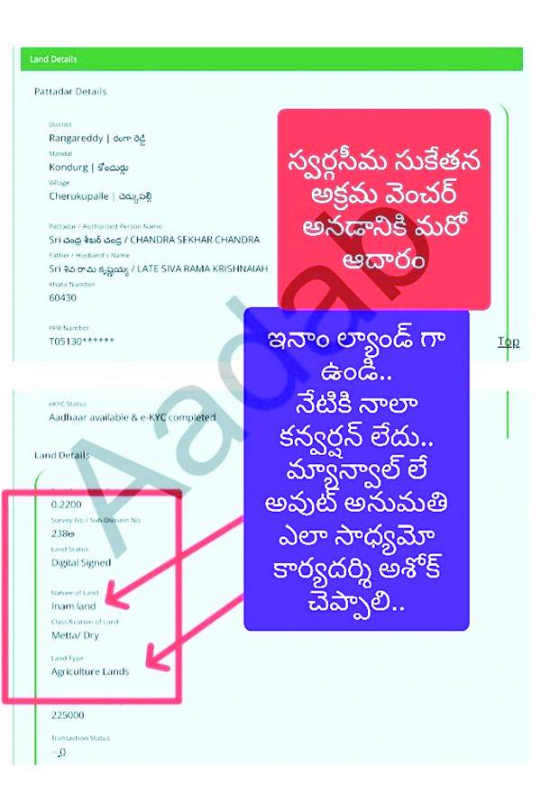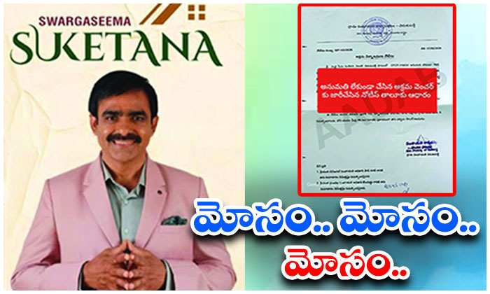 అధికారుల విచారణలో స్వర్గసీమ సుకేతన పేరుతో చేస్తున్న వెంచర్ అసలు బాగోతం బట్టబయ లైంది.. చంద్రశేఖర్ చేస్తున్న మోసాలను గుర్తించి అక్రమ వెంచర్ అంటూ.. చట్ట ప్రకారం చర్యలు తీసుకుంటా మని లెటర్ నెంబర్ జిపి/02/2026,తేది : 17/02/2026 న మొదట నోటీస్ ఇచ్చి చేతులు దులుపుకున్నారు కార్యదర్శి అశోక్..
