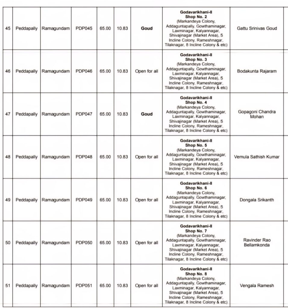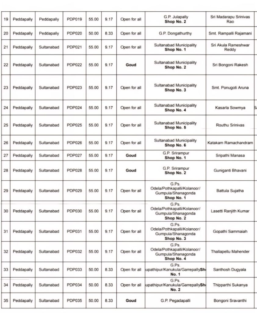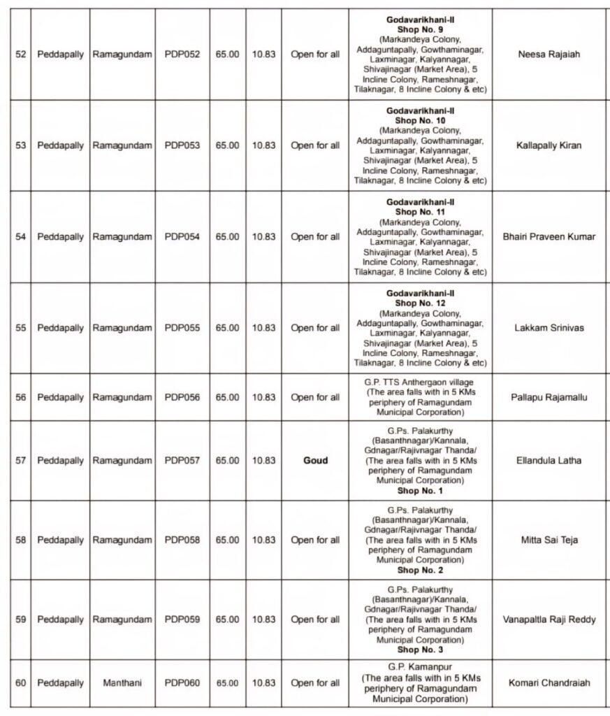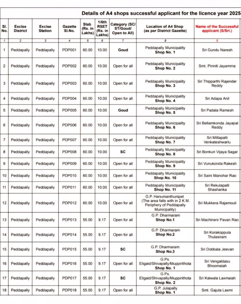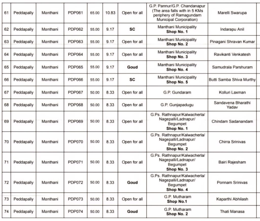 పెద్దపల్లి జిల్లాలో రెండేళ్ల కాలానికి 74 మద్యం (ఏ4) షాపుల కేటాయింపు (Allotment) ప్రక్రియ సోమవారం లాటరీ (Lottery) పద్ధతి ద్వారా విజయవంతంగా పూర్తయింది. స్థానిక సంస్థల అదనపు కలెక్టర్ జె.అరుణశ్రీ సమక్షంలో బంధంపల్లిలోని స్వరూప గార్డెన్స్లో ఈ ప్రక్రియ పారదర్శకంగా జరిగింది. 74 షాపుల కోసం మొత్తం 1507 దరఖాస్తులు రాగా ప్రభుత్వం జారీ చేసిన ఉత్తర్వుల ప్రకారం గౌడ (Gouds) కులస్థులకు 13, ఎస్సీ(Sc)లకు 8 షాపులు రిజర్వ్ (Reserve) చేశారు. మిగిలిన 53 షాపులను జనరల్ కేటగిరీ(General Category)లో లాటరీ ద్వారా దరఖాస్తుదారులకు కేటాయించారు. షాపులు దక్కించుకున్నవారు వెంటనే వార్షిక ఎక్సైజ్ పన్నులో 6వ వంతు చెల్లించి కన్ఫర్మేషన్ లెటర్ తీసుకోవాలని అధికారులు తెలిపారు. ఈ కార్యక్రమంలో జిల్లా ఎక్సైజ్ సూపరింటెండెంట్ మహిపాల్ రెడ్డి, ఎక్సైజ్ సీఐ నాగేశ్వరరావుతోపాటు దరఖాస్తుదారులు, ఎక్సైజ్ శాఖ సిబ్బంది, సంబంధిత అధికారులు పాల్గొన్నారు.