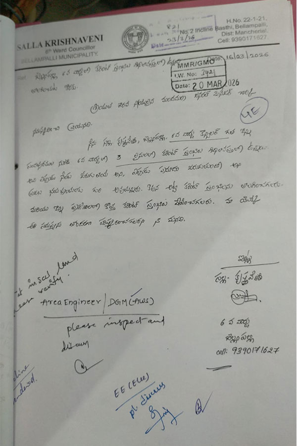 బెల్లంపల్లి పట్టణంలోని 6వ వార్డులో సింగరేణి విద్యుత్ స్తంభాలు ప్రమాదకర స్థితిలో ఉన్నాయని పాత కరెంటు స్తంభాలను తొలగించి, కొత్త స్థంబాలు వేయాలని అధికారులకు వినతిపత్రం సమర్పించిన 6వ వార్డ్ కౌన్సిలర్ సల్ల కృష్ణవేణి అయితే, దీనిపై స్పందించిన సింగరేణి అధికారులు పిల్లి శ్రీనివాస్ కొత్త కరెంటు స్తంభాలు వేయకుండా, విద్యుత్ సరఫరాను నిలిపివేసారు