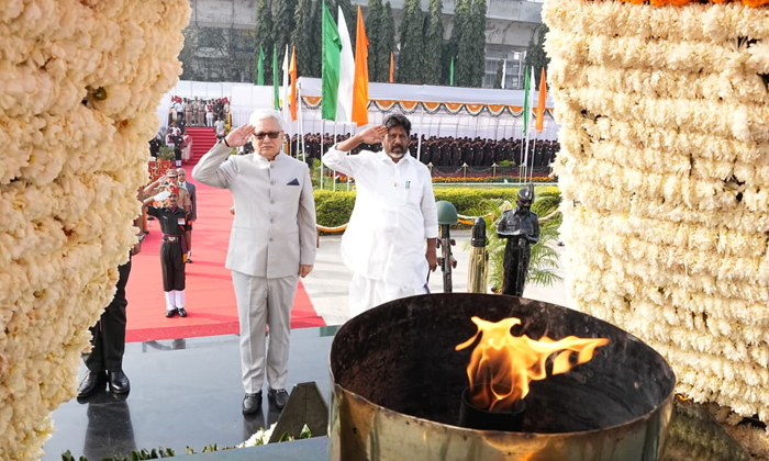 77వ గణతంత్ర దినోత్సవాల(Republic Day) సందర్భంగా సికింద్రాబాద్ పరేడ్ గ్రౌండ్స్లో జరిగిన వేడుకలకు డిప్యూటీ సీఎం మల్లు భట్టివిక్రమార్క(Mallu Bhattivikramarka) హాజరయ్యారు. గవర్నర్ జిష్ణుదేవ్ వర్మ(Governor Jishnu Dev Verma)తో కలిసి జాతీయ పతాకావిష్కరణలో పాల్గొన్నారు. అంతకుముందు వీరుల సైనిక స్మారకం వద్ద అమర వీరులకు ఘన నివాళులు అర్పించారు. రాజ్యాంగ(Constitution) విలువలే ప్రభుత్వానికి దిక్సూచి అని చెప్పారు. ప్రజాస్వామ్య స్ఫూర్తితో, అణగారిన వర్గాల అభ్యున్నతే లక్ష్యంగా ప్రభుత్వం సంక్షేమ పథకాలను ప్రతి ఇంటికీ చేరువ చేస్తోందని తెలిపారు. ప్రజా ప్రభుత్వంలో సామాన్యుడి ముఖంలో చిరునవ్వు చూడటమే అంతిమ లక్ష్యమని పేర్కొన్నారు. రాష్ట్ర ప్రజలందరికీ గణతంత్ర దినోత్సవ శుభాకాంక్షలు చెప్పారు.