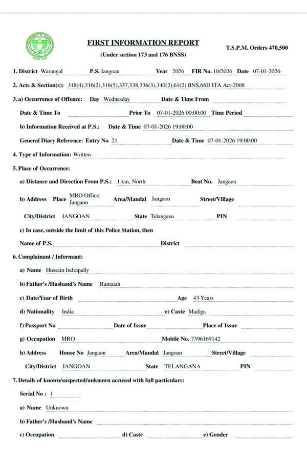 - జనగామ ఎమ్మార్వో ఫిర్యాదుతో పోలీస్ స్టేషన్లో ఎఫ్ఐఆర్ నమోదు