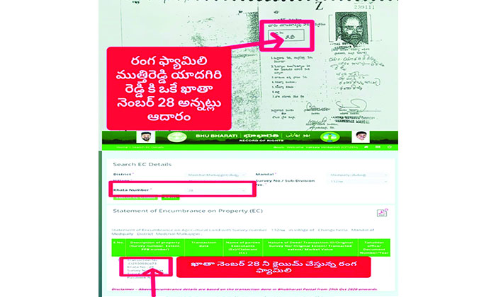 రంగ రాజారాం కుటుంబ సభ్యులు క్లెయిమ్ చేస్తున్న ఖాతా నెంబర్ 28ను టిఆర్ఎస్ పార్టీకి చెందిన జనగామ మాజీ ఎమ్మెల్యే ముత్తిరెడ్డి యాదగిరి రెడ్డి కూడా ఇదే ఖాతా నెంబర్ 28 క్లెయిం చేస్తున్నారని రెవెన్యూ రికార్డులు చూస్తే స్పష్టం అవుతుంది.. ఈ ఖాతా నెంబర్ ఆధారంగా ఆర్ఆర్ చట్ట ప్రకారం ఒక గ్రామంలో ఒక వ్యక్తికి ఒక ఖాతా నెంబర్ మాత్రమే ఉంటుందనేది జగమెరిగిన సత్యం..