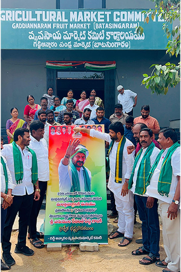కోహెడ ప్రాంతంలో అంతర్జాతీయ స్థాయిలో పండ్ల మార్కెట్ నిర్మాణానికి రాష్ట్ర మంత్రి మండలి ఆమోదం తెలపడంతో హర్షం వ్యక్తం చేసిన పాలకవర్గం సభ్యులు వివిధ రకాల పండ్ల రసాలతో ముఖ్యమంత్రి రేవంత్ రెడ్డి చిత్రపటానికి మార్కెట్ కమిటీ చైర్మన్ చిలుక మధుసూదన్ రెడ్డి , సభ్యులు , వర్తకులు, రైతులు అభిషేకం నిర్వహించారు. ఇబ్రహీంపట్నం ఎమ్మెల్యే మల్ రెడ్డి రంగారెడ్డిని కలిసిన పాలకవర్గం సభ్యులు ధన్యవాదములు తెలిపారు.