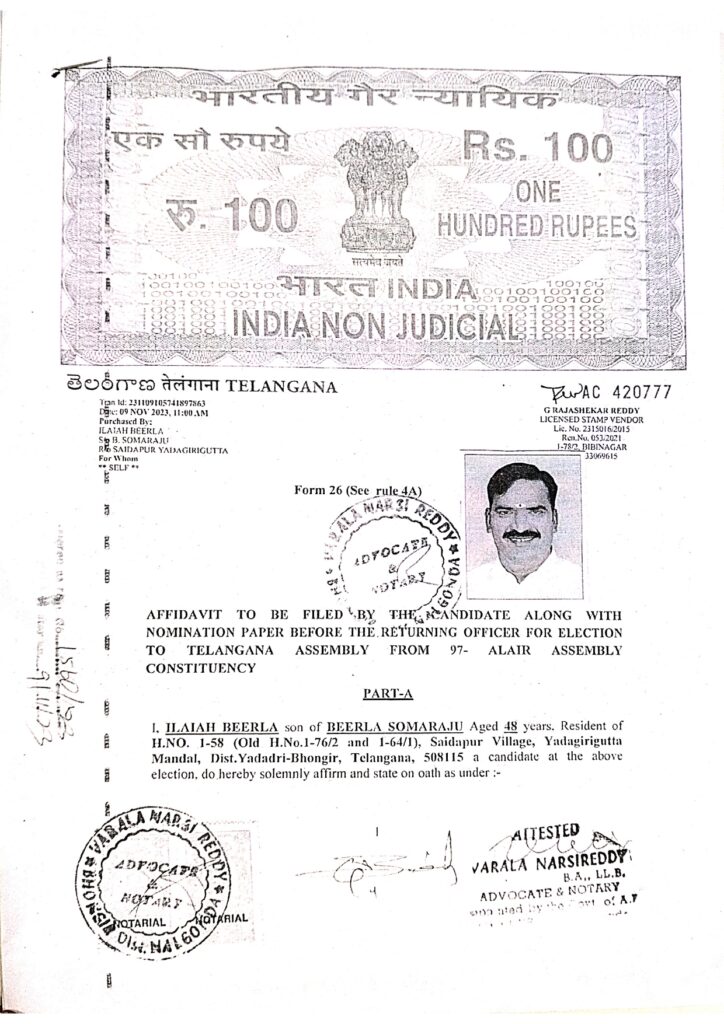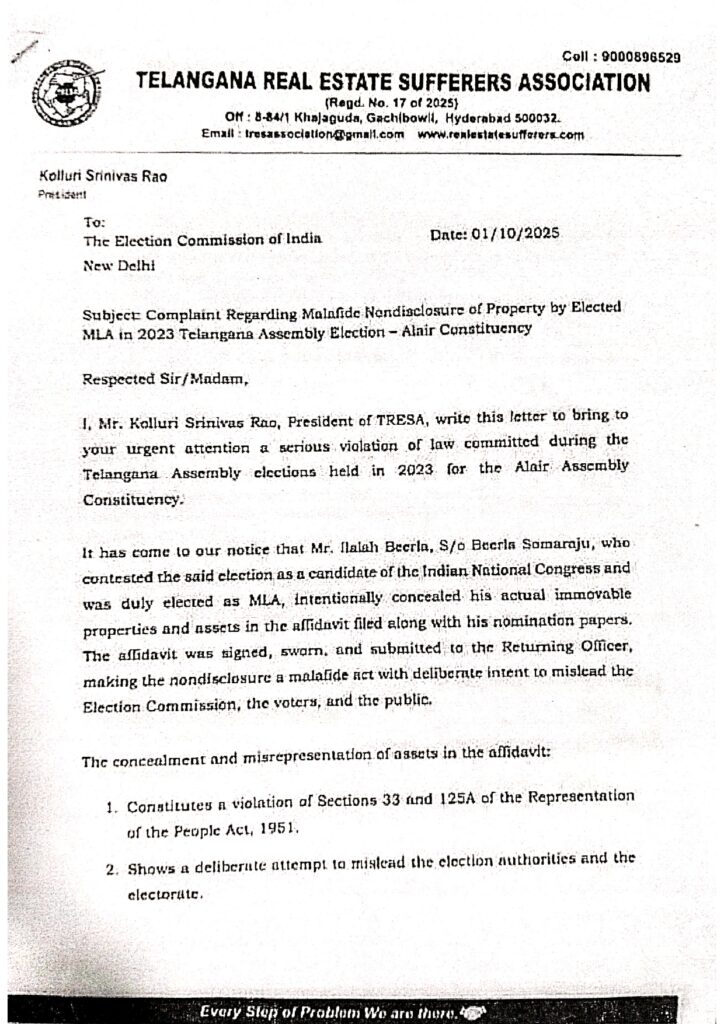 తెలంగాణ అసెంబ్లీ ఎన్నికల్లో చట్ట ఉల్లంఘన జరిగినట్లు తెలంగాణ రియల్ ఎస్టేట్ సఫరర్స్ అసోసియేషన్స్ (ట్రెసా) అధ్యక్షుడు కొల్లూరి శ్రీనివాస్ రావు ఎన్నికల సంఘానికి ఫిర్యాదు చేశారు. 2023లో జరిగిన అలేర్ అసెంబ్లీ నియోజకవర్గ ఎన్నికల్లో కాంగ్రెస్ పార్టీ అభ్యర్థిగా పోటీ చేసి విజయం సాధించిన ఎమ్మెల్యే బీర్ల అయిలయ్య (తండ్రి సోమరాజు) తన నామినేషన్ పత్రాలతో సమర్పించిన అఫిడవిట్లో తనకు చెందిన అసలు స్థిరాస్తులను ఉద్దేశపూర్వకంగా దాచిపెట్టారని ఆయన ఆరోపించారు. వివరాల ప్రకారం.. ఎమ్మెల్యే అయిలయ్య సమర్పించిన అఫిడవిట్లో తనకు కేవలం 30 ఎకరాలలోపే భూమి ఉన్నట్లు తప్పుడు సమాచారం ఇచ్చి ప్రజలను, ఎన్నికల అధికారులను మరియు ఎన్నికల సంఘాన్ని తప్పుదారి పట్టించే ప్రయత్నం చేశారని శ్రీనివాస్ రావు ఆరోపించారు.