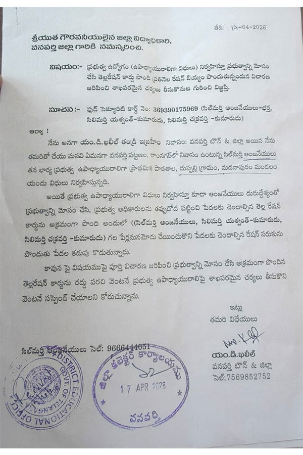 Homeమహబూబ్‌నగర్‌Complaint | అక్రమ రేషన్ కార్డు వినియోగం పై కలెక్టర్, డీఈఓ కు ఫిర్యాదు.