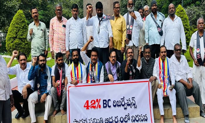 రెండు సంవత్సరాలుగా జీవోలు, ఆర్డినెన్స్, అసెంబ్లీ తీర్మానాల పేరుతో కాలయాపన చేసి చివరికి జీవోల పేరుతో మరోసారి బీసీల గొంతుకోసిన కాంగ్రెస్ ప్రభుత్వం (Congress Government) చట్ట ప్రకారం కాకుండా పార్టీ ప్రకారమే గ్రామ పంచాయతీ ఎన్నికలు (Panchayat Elections) నిర్వహిస్తామని చెప్పడం విడ్డూరమని 42% బీసీ రిజర్వేషన్ల సాధన సమితి (BC Resevation Sadhana Samithi) ధ్వజమెత్తింది. జీవో 46తో ఎన్నికలకు వెళ్లడం బీసీలను వంచించడమేనని మండిపడ్డారు. చట్టబద్ధత లేకుండా గ్రామ పంచాయతీలకు ఎన్నికలను జరపాలని, పార్టీ పరంగా 42% బీసీలకు కేటాయించి జరపాలని రాష్ట్ర మంత్రివర్గం (Cabinet) నిర్ణయించడాన్ని వ్యతిరేకిస్తూ గన్‌పార్క్‌లోని అమర వీరుల స్థూపం గన్ పార్క్ వద్ద నిరసన తెలిపింది.