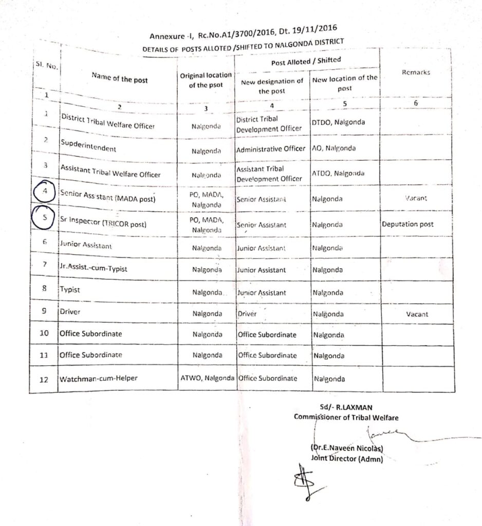 ‘సీనియర్ అసిస్టెంట్ దే హవా’! జిల్లా కార్యాలయంలో ప్రస్తుతం సీనియర్ అసిస్టెంట్ పోస్టు లేదు. ఉమ్మడి నల్గొండ జిల్లాగా ఉన్నప్పుడు డి.టి.డి.ఓ కార్యాలయంలో మూడు సీనియర్ అసిస్టెంట్ పోస్టులు ఉండగా పునర్విభజన తర్వాత కేడర్ స్ట్రెంత్ ప్రకారం రెండు సీనియర్ అసిస్టెంట్ పోస్టులు సూర్యాపేట జిల్లా కు, మరొకటి యాదాద్రి భువనగిరి జిల్లా కు కేటాయించబడినాయి. దీంతో నల్గొండ డిటిడిఓ కార్యాలయం లో సీనియర్ అసిస్టెంట్ పోస్ట్ లేదనేది వాస్తవం. అయినప్పటికీ దొడ్డి దారిలో ఉన్నతాధికారుల కళ్ల కు గంతలు కట్టి ‘మాడా’ కార్యలయం పేరుతో 8 సంవత్సరాల నుంచి డిటిడిఓ కార్యాలయం లో సీనియర్ అసిస్టెంట్ గా తిష్టవేసిన వ్యక్తి అందినకాడికి దోచుకుంటున్నాడు. జి.ఓ.నెం.140 ప్రకారం డిటిడిఓ కార్యాలయంలో అసలు పోస్ట్ తరలిపోయినా సరే ‘010’ పద్దు కింద వేతనం పొందుతున్నా కూడ ఉన్నతాధికారులు చూసి చూడనట్లు వ్యవహరించడం ఆరోపణలకు బలం చేకూర్చే విధంగా ఉంది. గిరిజన శాఖ రెవెన్యూ శాఖ మధ్య ఉన్న అక్రమ లావాదేవీలకు ఈ సీనియర్ అసిస్టెంట్ వారధిగా మారారని నకిలీ సంతకాలు, తప్పుదారి పట్టించే విధానాలను, ప్రోత్సహిస్తున్నాడని మరియు ఎస్టాబ్లిష్మెంట్, బడ్జెట్, బదిలీలు ప్రమోషన్లు, నిబంధనల వక్రీకరణ, అన్ని ఈ ఒక్కరి ఆధీనంలో ఉండటం పరిపాలన అవకతవకాలకు ఉదాహరణగా చెప్పవచ్చు. ఈ సీనియర్ అసిస్టెంట్ డిటిడిఓ తో సత్సంబంధాలు కలిగి ఉంటూ వసూల్ రాజాగా.. పేరు గడించాడనే విమర్శలు వెలువెత్తుతున్నాయి.