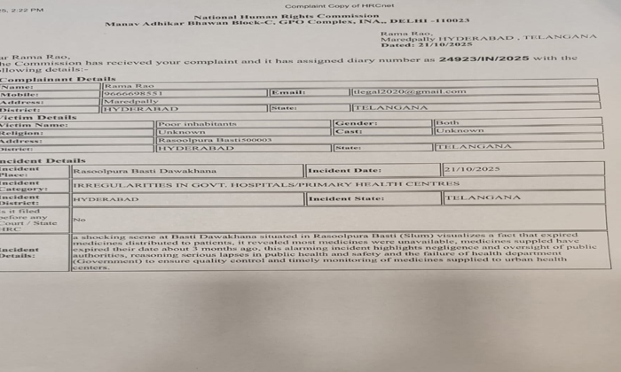 కాలం చెల్లిన మందుల పంపిణీని వెంటనే నిలిపివేసి, అన్ని అత్యవసర మందులను అందుబాటులో ఉంచేలా తెలంగాణ రాష్ట్ర ప్రజారోగ్య, కుటుంబ సంక్షేమ డైరెక్టర్ డాక్టర్ రవీంద్ర నాయక్ను ఆదేశించాలని కోరారు. కాలం చెల్లిన మందులను పంపిణీ చేసిన వైద్య అధికారులు, సంబంధిత సిబ్బందిపై చర్యలు తీసుకోవాలని డిమాండ్ చేశారు. ఫిర్యాదును స్వీకరించిన జాతీయ మానవ హక్కుల కమిషన్.. సంబంధిత డైరీ నంబర్ (24923/IN/2025) ఇచ్చింది.