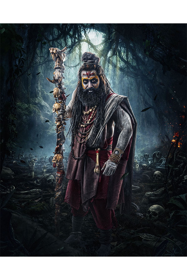 గరుడ రామ్ చేతిలో కపాలాలు, ఎముకలు, పాములతో అలంకరించిన భారీ దండ కనిపిస్తూ, చీకటి, నిషిద్ధ శక్తులను సూచిస్తోంది. అడవి, పాములు, చెల్లాచెదురుగా ఉన్న కపాలాలు మరింత క్యురియాసిటీ పెంచుతున్నాయి.