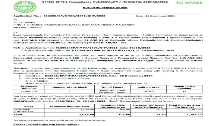 బిల్డింగ్ పర్మిట్(BP నం 0245/GHMC/SLP/2024-BP) ప్రకారం ఈ నిర్మాణం కేవలం నివాస ప్రయోజనాల కోసం మాత్రమే