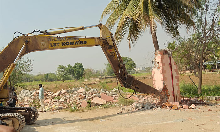 కోర్టు పరిధిలో ఉన్న 1264 ఎకరాల భూమిని కాపాడేందుకు పెద్ద ఎత్తున తరలివచ్చిన హైడ్రా సిబ్బంది సర్వే నంబర్ 171, 172, 173, 175, 212, 213 లలో న్యాయవాది ముఖీం గెస్ట్ హౌజ్ ను కూల్చి వేస్తున్న హైడ్రా అధికారులు సుమారు రెండెకరాల భూమిలో నిర్మించిన ఫాం హౌజ్