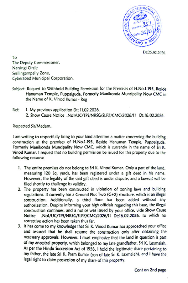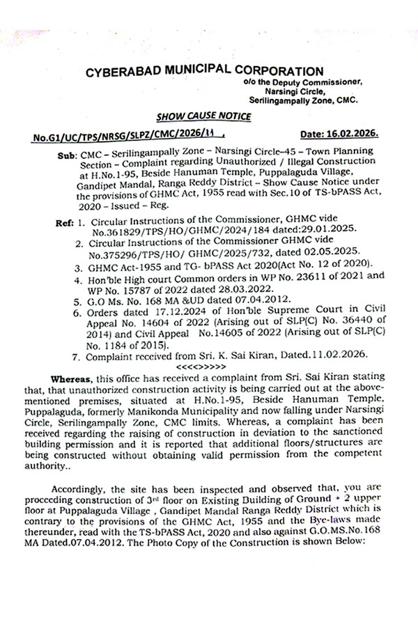 మణికొండ పరిధిలోని పుప్పాలగూడ హనుమాన్ గుడి పక్కన ఉన్న ఇంటినెబర్ 1-95లో ఎలాంటి అనుమతులు లేకుండా జీప్లస్ టూ భవనం నిర్మించారు. మొత్తం సుమారుగా 250 గజాల స్థలంలో 120 గజాలు మాత్రమే రెవెన్యూ రికార్డుల్లో ఉన్నట్లు తెలుస్తున్నది. దీంతో ఆ ఇంటికి పన్ను కూడా 120 గజాలకు మాత్రమే వస్తున్నట్లు తెలుస్తున్నది. అక్రమ నిర్మాణంపై నార్సింగి సర్కిల్ సైబరాబాద్ మున్సిపల్ కార్పొరేషన్ అధికారులకు ఫిర్యాదు చేయగా గతనెల 16న షోకాజు నోటీసులు జారీ చేశారు. ఈ నోటీసుల్లో కేవలం అదనపు అంతస్థును మాత్రమే పేర్కొన్నారు.