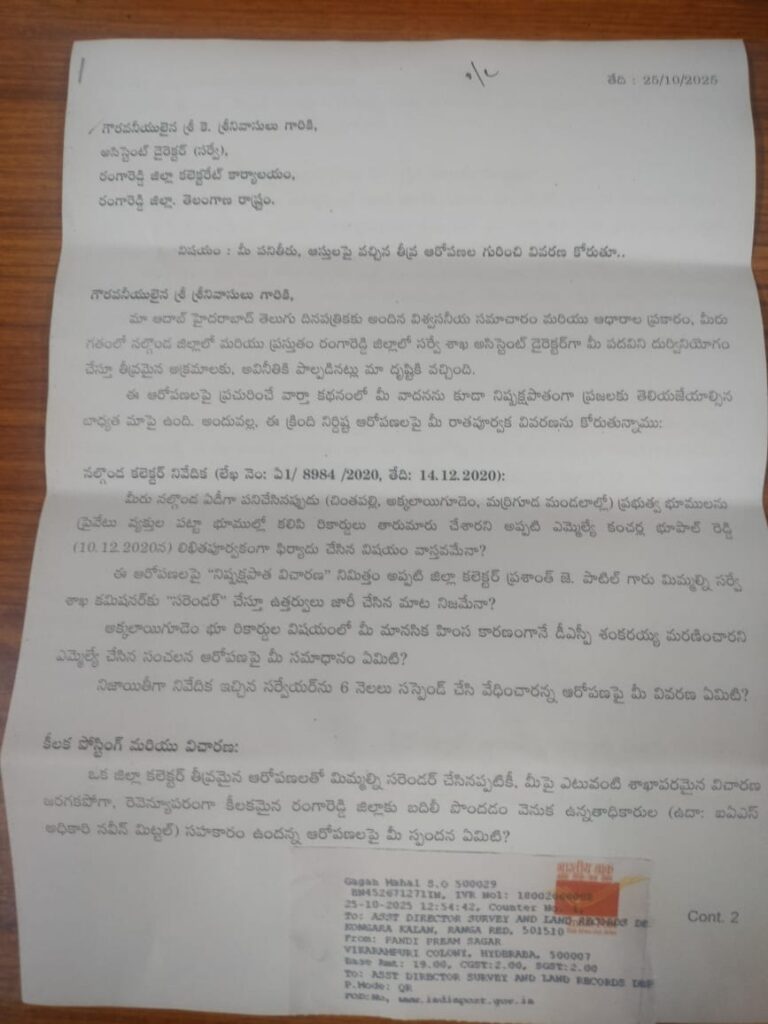 ప్రభుత్వ పరిపాలనలో దొర్లిన ఘోరమైన తప్పిదానికి, అవినీతిపరులైన అధికారుల(Corrupt Officials)కు వ్యవస్థీకృతంగా లభిస్తున్న సహాయ సహకారాలకు అద్దం పట్టేలా సర్వే సెటిల్మెంట్స్ మరియు ల్యాండ్ రికార్డ్స్ శాఖ అసిస్టెంట్ డైరెక్టర్ (ఏడీ) కె. శ్రీనివాసులు (AD Srinivasulu) ఉదంతం నిలుస్తోంది. నల్గొండ జిల్లా(Nalgonda District)లో పనిచేసినప్పుడు భూ అక్రమాలకు పాల్పడటం, సిబ్బందిని వేధించడం, చివరకు ఒక డీఎస్పీ మృతి(Dsp Death)కి కారణమయ్యారంటూ సంచలన ఆరోపణలు ఎదుర్కొని, స్వయంగా జిల్లా కలెక్టర్ చేత “సరెండర్” (Surrender) చేయబడిన అధికారికి… శిక్ష పడకపోగా, తెలంగాణ రాష్ట్రంలోనే అత్యంత కీలకమైన, రెవెన్యూపరంగా బలమైన రంగారెడ్డి జిల్లాకు బదిలీ కావడం ప్రభుత్వ పరిపాలనా వైఫల్యాన్ని, అవినీతిపరులకు అందుతున్న అండను బట్టబయలు చేస్తోంది.