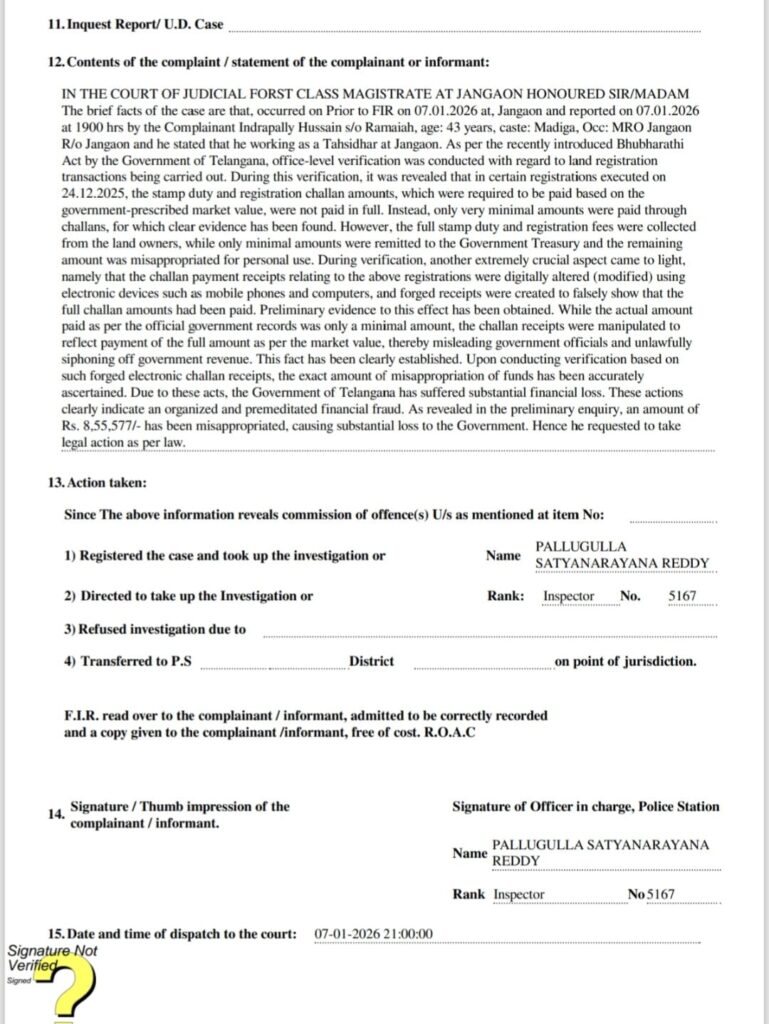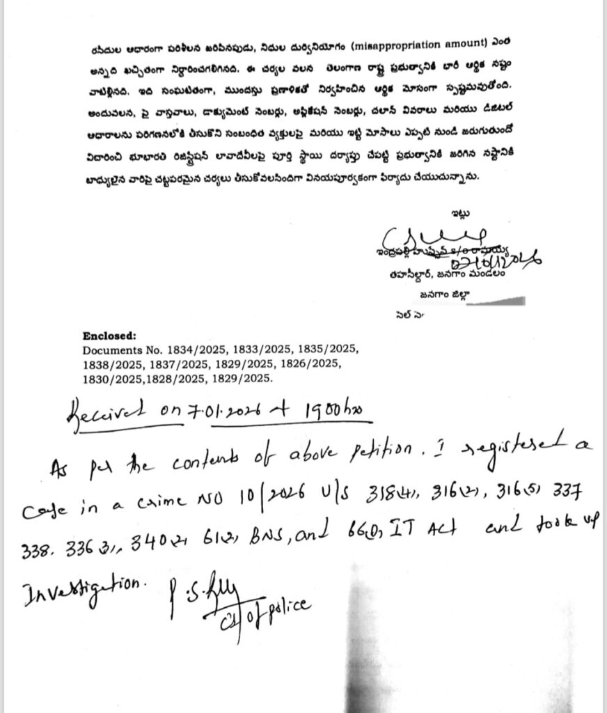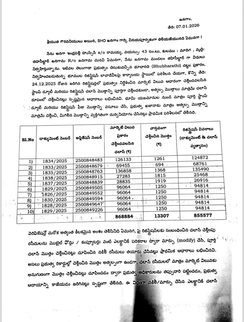 ఈ విధంగా నకిలీ లేదా మార్పు చేసిన ఎలక్ట్రానిక్ చలాన్ రసీదుల ఆధారంగా పరిశీలన జరిపినప్పుడు నిధుల దుర్వినియోగం ఎంత అనేది ఖచ్చితంగా నిర్థారణ అయింది. ఈ చర్యల వల్ల తెలంగాణ రాష్ట్ర ప్రభుత్వానికి భారీగా ఆర్థిక నష్టం వాటిల్లింది. ఇది సంఘటితంగా, ముందస్తు ప్రణాళికతో నిర్వహించిన ఆర్థిక మోసంగా స్ఫష్టమవుతోంది. అందువల్ల ఈ వాస్తవాలను, డాక్యుమెంట్ నంబర్లను, చలాన్ వివరాలను, డిజిటల్ ఆధారాలను పరిగణనలోకి తీసుకొని సంబంధిత వ్యక్తులపై చర్యలు తీసుకోవాలి. ఈ మోసాలు ఎప్పటి నుంచి జరుగుతున్నాయో విచారించి భూభారతి రిజిస్ట్రేషన్ లావాదేవీలపై పూర్తి స్థాయి దర్యాప్తు చేపట్టి ప్రభుత్వానికి జరిగిన నష్టానికి బాధ్యులైనవారిపై చట్టపరమైన చర్యలు తీసుకోవాలని కోరుతున్నాను’ అని జనగాం మండల తహశీల్దార్ తన ఫిర్యాదులో పేర్కొన్నారు.