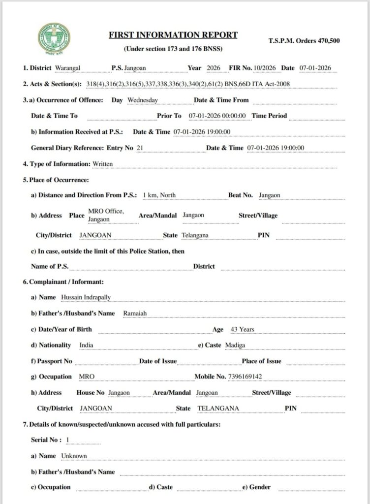 ఎమ్మార్వో ఫిర్యాదుతో జనగామ పోలీస్ స్టేషన్లో ఎఫ్ఐఆర్ నమోదు