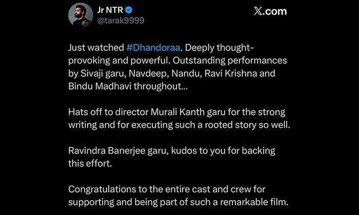 ఇలాంటి గొప్ప సినిమాలో భాగమైన నటీనటులు, సాంకేతిక బృందానికి హృదయపూర్వక అభినందనలు’’ అని ‘దండోరా’ చిత్ర యూనిట్ను అభినందించారు ఎన్టీఆర్.