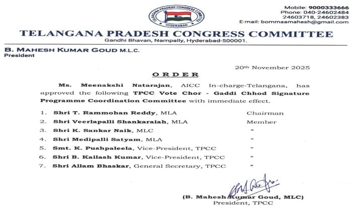 తెలంగాణ ప్రదేశ్ కాంగ్రెస్ కమిటీ (TPCC) ఉపాధ్యక్షుడి(Vice president)గా బి.కైలాష్ కుమార్(kailash kumar)ను నియమించారు. “ఓట్ చోర్ గడ్డీ చోడ్ కమిటీ ఫర్ సిగ్నేచర్స్ క్యాంపెయిన్” సభ్యుడిగా కూడా ఎంపిక చేశారు. కాంగ్రెస్ పార్టీ తెలంగాణ రాష్ట్ర వ్యవహారాల ఇన్ఛార్జ్, జనరల్ సెక్రటరీ మీనాక్షి నటరాజన్(Meenakshi Natarajan), TPCC చీఫ్ మహేష్ కుమార్ గౌడ్ (Mahesh kumar goud) ఈ మేరకు నిర్ణయం తీసుకున్నారు. ఎన్నికల్లో చట్ట వ్యతిరేక చర్యలు, ఓట్ల చోరీపై ప్రజల్లో అవగాహన పెంచేందుకు కొనసాగుతున్న సంతకాల ప్రచార కార్యక్రమంలో కైలాష్ కుమార్ నాయకత్వానికి గుర్తించిన పార్టీ పెద్దలు ఈ పదవి ఇచ్చారు.