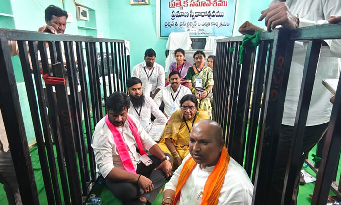 నిర్మల్ జిల్లా ఖానాపూర్ మున్సిపల్ చైర్మన్ ఎన్నికలో అధికారులు జాప్యం చేస్తున్నారని, కాంగ్రెస్ పార్టీకి వత్తాసు పలుకుతున్నారని ఆరోపిస్తూ మున్సిపల్ కార్యాలయం మీదకు దూసుకు వచ్చిన బిజెపి శ్రేణులు, బిజెపి జిల్లా అధ్యక్షులు రితీష్ రాథోడ్.