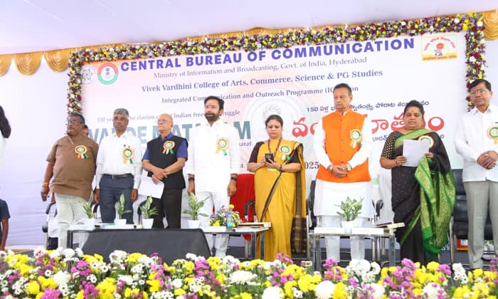 వందేమాతరం(Vande mataram) గీతం 150 ఏళ్లు పూర్తిచేసుకున్న సందర్భంగా హైదరాబాద్లోని వివేక వర్ధిని కళాశాలలో జరిగిన కార్యక్రమంలో కేంద్ర మంత్రి(Union Minister) కిషన్ రెడ్డి పాల్గొని ప్రసంగించారు. వందేమాతరం అనే నినాదం.. రెండు పదాల కలయిక మాత్రమే కాదని చెప్పారు. దేశానికి స్వాతంత్ర్యం అందించేందుకు పెద్దలు పడిన తపన, తాపత్రయం, నిస్వార్థ త్యాగం, భరతజాతి ఆత్మగౌరవానికి(Self Respect) వందేమాతరం ప్రతీక అని తెలిపారు. దేశ స్వాతంత్ర్య పోరాటంలో దేశభక్తి భావనను పెంపొందించడంలో వందేమాతరం ఒక ప్రేరణాత్మక రణనినాదంగా కీలక పాత్ర పోషించిందని పేర్కొన్నారు.