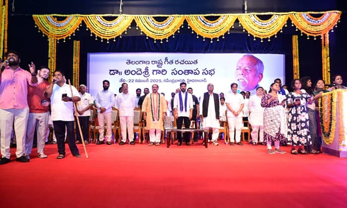 హైదరాబాద్లోని రవీంద్రభారతిలో జరిగిన ప్రముఖ కవి, రచయిత అందెశ్రీ (Andesri) సంతాప సభ(Condolence meeting)లో మంత్రి పొన్నం ప్రభాకర్ పాల్గొన్నారు. ఈ సందర్భంగా ఆయనకు ఘనంగా నివాళులు అర్పించారు. అనంతరం పొన్నం ప్రభాకర్ మాట్లాడుతూ.. అందెశ్రీ తన పాటల(Songs)తో తెలంగాణ ఉద్యమ స్ఫూర్తి(Telangana movement spirit)ని నింపారని చెప్పారు. 2009లో 15వ లోక్సభ(Lok Sabha)లో తెలంగాణ ఉద్యమం సందర్భంగా ఉద్యమ స్ఫూర్తిని నింపటం తద్వారా తెలంగాణ సాధనకు మూల కారకులుగా నిలిచి జీవితాన్ని కొనసాగించారని తెలిపారు. తెలంగాణ ఉద్యమంలో అందెశ్రీ పాటలు మనందరికీ స్ఫూర్తిదాయకంగా (Inspirational) నిలిచాయని పేర్కొన్నారు.