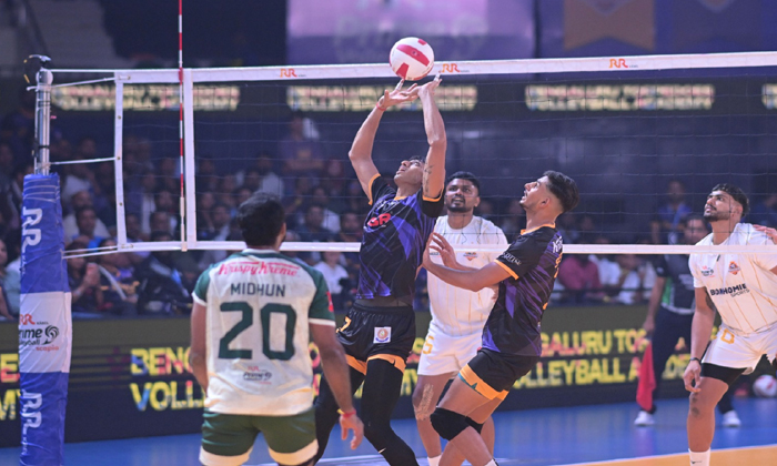 హైదరాబాద్: ఆర్ఆర్ కేబుల్ ప్రైమ్ వాలీబాల్ లీగ్(PVL) సీజన్ 4లో ముంబై మీటియర్స్ (Mumbai Meteors) టైటిల్ పోరుకు చేరుకుంది. గ్రూప్ దశలో అగ్రస్థానంలో నిలిచిన ముంబై మీటియర్స్ శుక్రవారం గచ్చిబౌలి ఇండోర్ స్టేడియం(Gachibowli Indoor Stadium)లో జరిగిన సెమీఫైనల్లోనూ (Semi Final) అదే జోరు కొనసాగించింది. గోవా గార్డియన్స్(Goa Guardians)పై 15-8, 15-8, 16-14తో వరుస సెట్లలో ఘన విజయం సాధించింది. సెమీఫైనల్లో గోవా గార్డియన్స్ ఆశించిన ప్రదర్శన కనబరచటంలో విఫలమైంది. శుభమ్ చౌదరి ప్లేయర్ ఆఫ్ ది మ్యాచ్(Player Of The Match)గా నిలిచాడు. అహ్మదాబాద్ డిఫెండర్స్(Ahmedabad Defenders), బెంగళూరు టార్పెడోస్(Bangalore Torpedoes) తలపడే రెండో సెమీఫైనల్ విజేతతో ఆదివారం ముంబై మీటియర్స్ ఫైనల్లో పోటీపడనుంది.