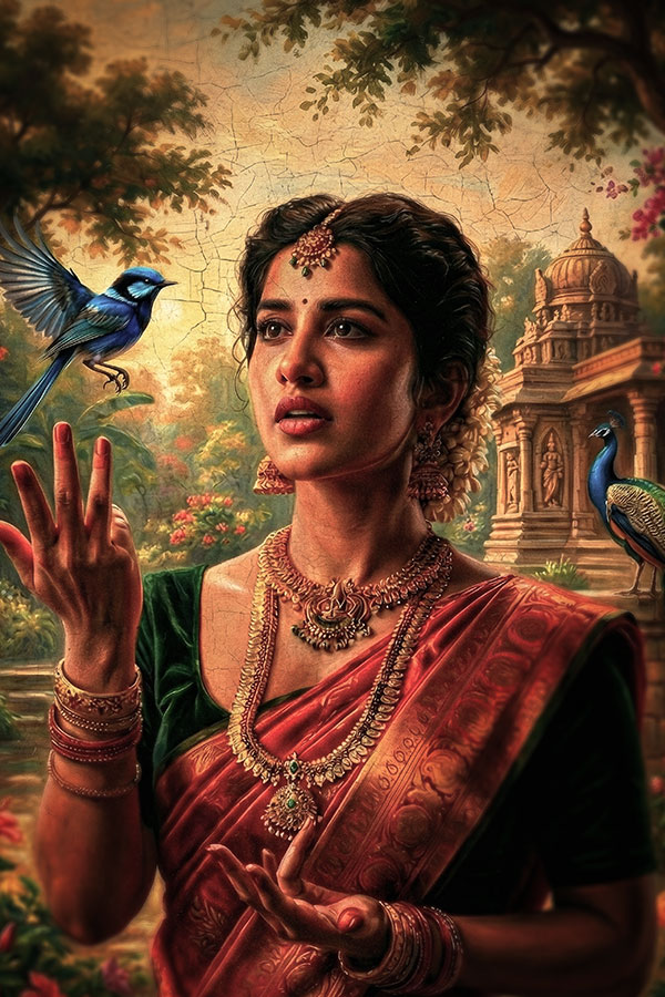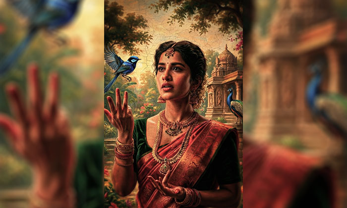 పోస్టర్కు మరింత వైభవాన్ని జోడిస్తూ ఆమె చేయి సమీపంలో నీలి రంగు పక్షి దర్శనమిస్తుంది. పక్కనే రాజసంగా నిలిచిన నెమలి, వెనుక కనిపించే ఆలయ నేపథ్యం ఈ అన్నీ పాత్రను అద్భుతంగా ఆవిష్కరిస్తున్నాయి.