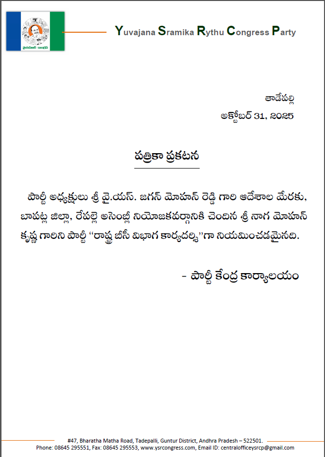 వైఎస్సార్సీపీ కార్యాలయం అధికారిక ప్రకటన