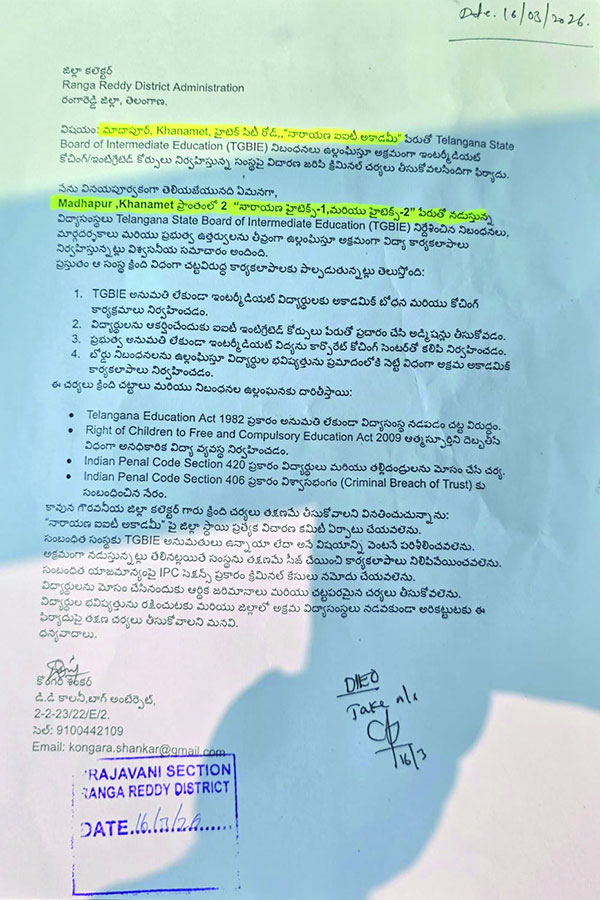 అనుమతులు లేని అకాడమీ.. ప్రమాదంలో విద్యార్థుల భవిష్యత్తు! మాదాపూర్, ఖానామేట్ ప్రాంతంలో, నారాయణా అకాడమీ, హైటెక్స్ – 1, హైటెక్స్ – 2 పేరుతో నడుస్తున్న విద్యాసంస్థలు కార్పొరేట్ ముసుగులో విద్యా వ్యాపారం సాగిస్తున్నారు.. హైటెక్ సిటీ నడిబొడ్డున సాగుతున్న విద్యా సంస్థలు, తెలంగాణ ఇంటర్మీడియట్ బోర్డు నిబంధనలను బేఖాతరు చేస్తూ వేల కోట్ల రూపాయల దందాను కొనసాగిస్తున్నాయి.కొన్ని కాలేజీలకు అనుమతులు శూన్యం.. ఆకర్షణే లక్ష్యంగా సాగిపోతున్నాయి.. తెలంగాణ స్టేట్ బోర్డ్ ఆఫ్ ఇంటర్మీడియట్ ఎడ్యుకేషన్ నుంచి కనీస అనుమతులు లేకపోయినా, ఈ అకాడమీలు యథేచ్ఛగా ఇంటర్మీడియట్ విద్యను బోధిస్తున్నాయి.