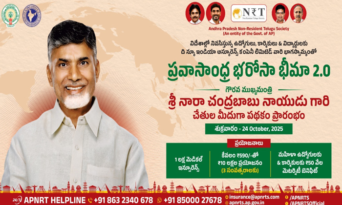 విజయవాడ: ప్రవాసాంధ్రుల సంక్షేమం, అభివృద్ధి, భద్రతలో భాగంగా ఏపీ ప్రభుత్వం ఏపీఎన్ఆర్‌టీ (APNRT) సొసైటీ ద్వారా ప్రవాసాంధ్ర భరోసా బీమా పథకాన్ని (Pravasandhra Bharosa Insurance Scheme) అందిస్తోంది. ఈ పథకాన్ని సీఎం చంద్రబాబు (CM Chandra Babu) శనివారం దుబాయ్‌(Dubai)లో ప్రారంభించారు. విదేశాల్లో పనిచేస్తున్న ఆంధ్రప్రదేశ్‌కు చెందిన ఉద్యోగులు, విద్యార్థులు దీని ద్వారా లబ్ధి పొందొచ్చు.