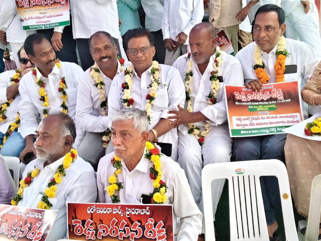 హైదరాబాద్: తెలంగాణ రాష్ట్ర రెడ్డి సంఘాల (Reddy Communities) ఆధ్వర్యంలో మంగళవారం హైదరాబాద్లోని ఇందిరా పార్క్ వద్ద నిర్వహించిన రెడ్డి నిరసన దీక్ష (Reddy’s Protest) ఘనంగా జరిగింది. ఉదయం 11 గంటలకు ప్రారంభమైన ఈ దీక్ష సాయంత్రం 4 గంటల వరకు కొనసాగింది. రాష్ట్ర వ్యాప్తంగా వివిధ జిల్లాల నుంచి వేలాది మంది రెడ్డి సంఘాల ప్రతినిధులు, విద్యార్థులు, ఉద్యోగ అభ్యర్థులు, మహిళలు, వృద్ధులు పాల్గొని కార్యక్రమంలో ఉత్సాహం నింపారు.