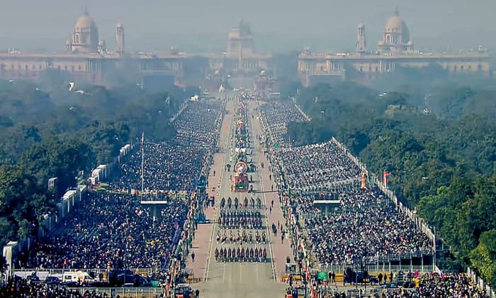 రాష్ట్రపతి ద్రౌపది ముర్ము (President Droupadi Murmu), కోస్టా, ఉర్సులా వాన్ డెర్ లేయన్ సాంప్రదాయ బగ్గీలో కర్తవ్య పథ్ వద్దకు చేరుకున్న తర్వాత గౌరవ వందనం స్వీకరించడంతో కవాతు ప్రారంభమైంది. ప్రధాని మోదీ(PM Modi), రక్షణ శాఖ మంత్రి రాజ్నాథ్ సింగ్, సీనియర్ కేంద్ర మంత్రులు, ఉన్నత సైనిక అధికారులు, విదేశీ దౌత్యవేత్తలు, పౌర సేవకులు హాజరయ్యారు. వివిదతా మే ఏక్తా(భిన్నత్వంలో ఏకత్వం) అనే ఇతివృత్తంతో జరిగిన ఈ కవాతులో దాదాపు 100 మంది కళాకారులు పాల్గొన్నారు. దేశ ఐక్యత, గొప్ప సాంస్కృతిక వైవిధ్యాన్ని ప్రదర్శించే సంగీత వాయిద్యాల గొప్ప ప్రదర్శన జరిగింది. ఈ కవాతుకు పరేడ్ కమాండ్ లెఫ్టినెంట్ జనరల్ భవ్నీష్ కుమార్ నాయకత్వం వహించారు.