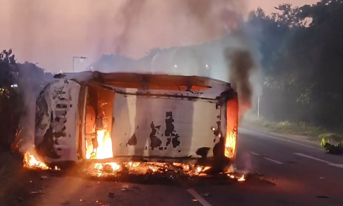 నల్లగొండ జిల్లా చిట్యాల మండలం గుండ్రాంపల్లి వద్ద రోడ్డు ప్రమాదం (Road Accident) జరిగింది. ఇన్నోవా కారు (Innova Car) అదుపు (Control) తప్పి డివైడర్(Divider)ను ఢీకొని పల్టీ కొట్టింది. ప్రమాద ధాటికి ఇంజన్(Engine)లో మంటలు (Fire) చెలరేగి కారు దగ్ధమైంది. అందులో ప్రయాణిస్తున్న 8 మంది సురక్షితం(Safe)గా బయటపడ్డారు. వాహనం రోడ్డుకు అడ్డంగా పడటంతో హైదరాబాద్-విజయవాడ జాతీయ రహదారిపై భారీగా ట్రాఫిక్ జామ్ (Taffic Jam) అయింది.