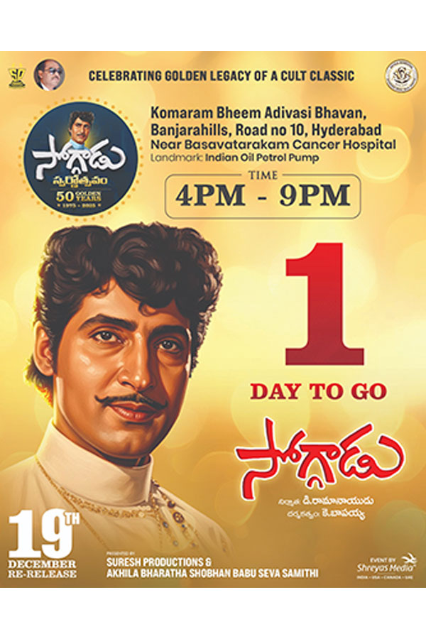 ఈ నెల 19న (శుక్రవారం) సాయంత్రం 6 గంటలకు హైదరాబాద్, బంజారాహిల్స్, రోడ్ నెం 10లోని (బసవతారకం క్యాన్సర్ ఆస్పత్రి సమీపంలో)  కొమరం భీమ్ ఆదివాసీ భవన్ లో పలువురు సినీ ప్రముఖుల సమక్షంలో ఈ స్వర్ణోత్సవాన్ని కన్నుల పండువగా జరపనున్నారు. ఈ ఈవెంట్ లో ప్రముఖ నటీమణులు జయచిత్ర, జయసుధ, రాధిక, సుమలత, ప్రభ, రోజారమణి తదితరులతో పాటు ప్రముఖ గాయని పి.సుశీల, సురేష్ ప్రొడక్షన్స్ అధినేత డి.సురేష్ బాబు, అట్లూరి పూర్ణచంద్రరావు, రాశీ మూవీస్ నరసింహారావు, దర్శకులు ఎ.కోదండరామిరెడ్డి, బి.గోపాల్ వంటి ఇంకా పలువురు ప్రముఖులు పాల్గొంటారు. ఇక సురేష్ ప్రొడక్షన్స్ 19న ‘సోగ్గాడు’ సినిమాను రీ రిలీజ్ చేయనుంది.