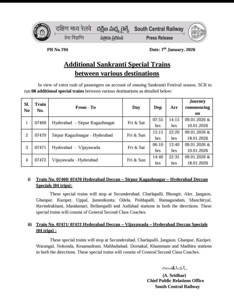 సంక్రాంతి పండుగ నేపథ్యంలో ఉత్తర తెలంగాణ(North Telangana) ప్రజల కోసం ప్రత్యేక రైళ్ల(Special Trains)ను ప్రవేశపెట్టారు. ఇవి ఈ నెల 9, 10, 18 తేదీల్లో 4 ట్రిప్పులు తిరుగుతాయి. ఈ విషయాన్ని సిర్పూర్ ఎమ్మెల్యే(Sirpur MLA) డాక్టర్ పాల్వాయి హరీష్ బాబు(Palvai Harish Babu) ఒక ప్రకటనలో తెలిపారు. సంక్రాంతి రద్దీ దృష్ట్యా హైదరాబాద్-కాగజ్ నగర్ మధ్య ప్రత్యేక రైళ్లు నడపాలని ఆయన గత నెలలో దక్షిణ మధ్య రైల్వే(South Central Railway) జనరల్ మేనేజర్కి వినతి పత్రం ఇచ్చారు. ఈ నేపథ్యంలో దక్షిణ మధ్య రైల్వే తాజా నిర్ణయం తీసుకుందని చెప్పారు. స్థానిక ప్రజలు ఈ సదుపాయాన్ని విరివిగా ఉపయోగించుకోవాలని సూచించారు. సంక్రాంతి సందర్భంగా హైదరాబాద్, కాగజ్ నగర్ మధ్య ప్రత్యేక రైళ్లను ప్రవేశపెట్టడం ఇదే తొలిసారి అని పేర్కొన్నారు.