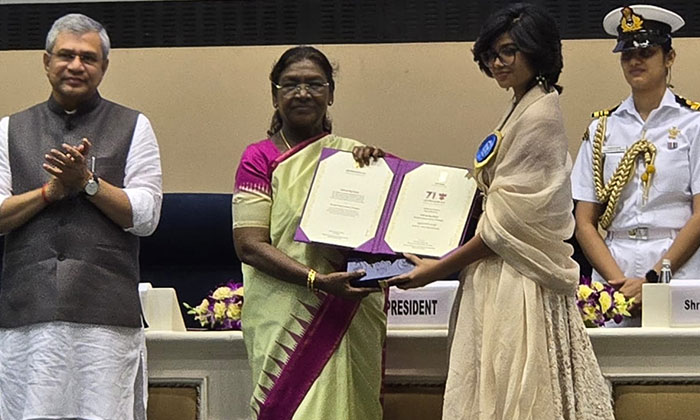 71వ జాతీయ చలన చిత్ర అవార్డుల ప్రధానోత్సవం మంగళవారం ఢీల్లీలోని విజ్ఞాన్ భవన్లో అంగరంగ వైభవంగా జరిగింది. 2023 సంవత్సరానికి గాను కేంద్రప్రభుత్వం ఉత్తమ చిత్రాలు, నటులు, సాంకేతిక నిపుణులను ఎంపిక చేసిన విషయం తెలిసిందే. అవార్డు విజేతలకు భారత రాష్ట్రపతి ద్రౌపదీ ముర్ము పురస్కారాలతో పాటు జ్ఞాపికలు, ప్రశాంసపత్రాలను అందజేశారు. ఇందులో భాగంగా ‘గాంధీ తాత చెట్టు’ చిత్రంలో ఉత్తమ నటనను కనబరిచి ప్రేక్షకుల అభినందనలు, విమర్శకుల ప్రశంసలు సైతం అందుకున్న ప్రముఖ దర్శకుడు సుకుమార్ తనయురాలు సుకృతి వేణి బండ్రెడ్డి ఉత్తమ బాలనటిగా అవార్డును అందుకున్నారు. ఈ సందర్భంగా రాష్ట్రపతి ద్రౌపది ముర్ము గారి ప్రసంగంలో గాంధీ తాత చెట్టు సినిమా గురించి, ఆ చిత్రంలో అందరూ ప్రశంసించ దగ్గ నటనను కనబరిచిన సుకృతి వేణి గురించి ఆమె ప్రత్యేకంగా ప్రశంసించడం.. మాట్లాడటం విశేషంగా చెప్పుకోవాలి.