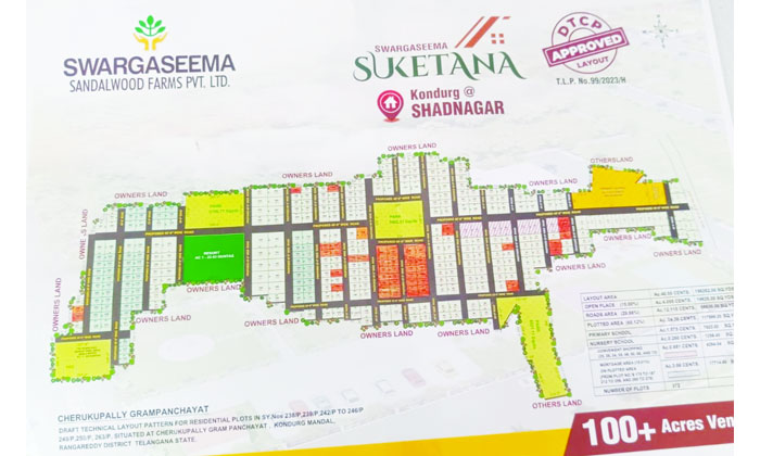 స్వర్గసీమ శాండిల్ పేరుతో ఉన్న ఈ వెంచర్ లో 75 ఎకరాల భూమిలో.. గుంటల్లో అమ్మి సొమ్ము చేసుకున్నారు.. ఫాం ల్యాండ్ పేరుతో గ్రేటెడ్ కమ్యూనిటీ అన్నట్లు కలరింగ్ ఇస్తూ.. ప్రహరీ గోడను నిర్మించాడు.. పంచాయతీ రాజ్ చట్టం 2018 నిబంధనలు తుంగలో తొక్కి అక్రమ నిర్మాణాలకు పాల్పడ్డాడు చండ్ర చంద్ర శేఖర్.. షాద్ నగర్ లో ప్లాట్లు అని చెపుతూ కష్టమర్లను మోసం చేస్తూ.. మహబూబ్ నగర్ లో ప్లాట్లు అమ్ముతున్నాడు..