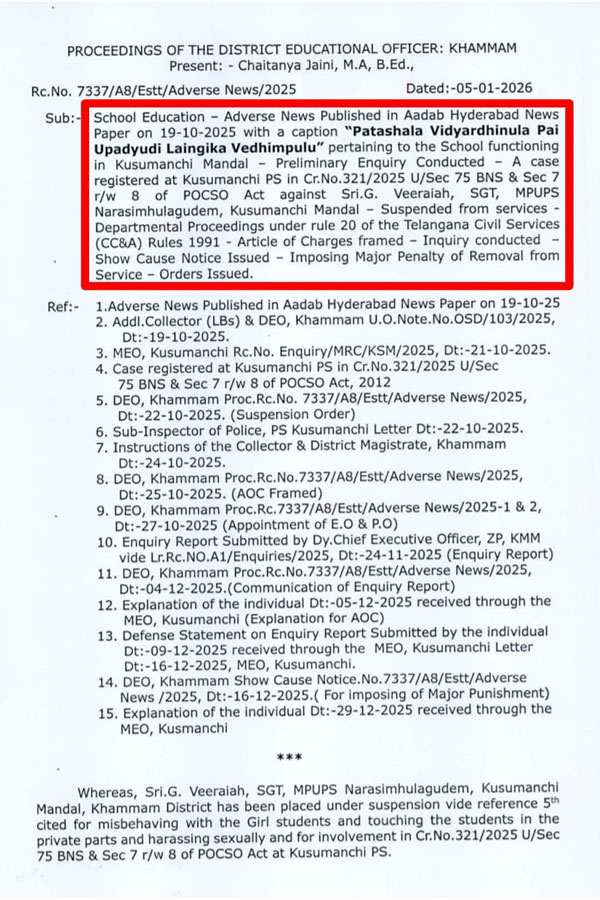 కూసుమంచి మండలంలోని నరసింహులగూడెం ప్రాథమికోన్నత పాఠశాల విద్యార్థినీల పై లైంగిక వేధింపులకు పాల్పడిన ఎస్జిటి ఉపాధ్యాయుడు జి.వీరయ్యను ఉద్యోగం నుండి (రిమూవల్ ఫ్రం సర్వీస్) తొలగిస్తూ జిల్లా విద్యాధికారిణి చైతన్య జైనీ సోమవారం ఉత్తర్వులు జారీ చేశారు.గతేడాది అక్టోబర్ 19 న విద్యార్థినీల పై ఉపాధ్యాయుడు లైంగిక వేధింపులు అనే శీర్షికన ఆదాబ్ హైదరాబాద్ దినపత్రికలో ప్రచురితమైన కథనం పై అప్పటి విద్యాధికారిణి డా.పి.శ్రీజ స్పందించి విచారణ చేపట్టారు.విచారణ అనంతరం అక్టోబర్ 22 న ఉపాధ్యాయుడు జి.వీరయ్యను సస్పెండ్ చేశారు.