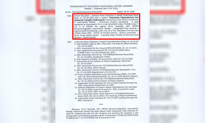 కూసుమంచి మండలంలోని నరసింహులగూడెం ప్రాథమికోన్నత పాఠశాల విద్యార్థినీల పై లైంగిక వేధింపులకు పాల్పడిన ఎస్జిటి ఉపాధ్యాయుడు జి.వీరయ్యను ఉద్యోగం నుండి (రిమూవల్ ఫ్రం సర్వీస్) తొలగిస్తూ జిల్లా విద్యాధికారిణి చైతన్య జైనీ సోమవారం ఉత్తర్వులు జారీ చేశారు.గతేడాది అక్టోబర్ 19 న విద్యార్థినీల పై ఉపాధ్యాయుడు లైంగిక వేధింపులు అనే శీర్షికన ఆదాబ్ హైదరాబాద్ దినపత్రికలో ప్రచురితమైన కథనం పై అప్పటి విద్యాధికారిణి డా.పి.శ్రీజ స్పందించి విచారణ చేపట్టారు.విచారణ అనంతరం అక్టోబర్ 22 న ఉపాధ్యాయుడు జి.వీరయ్యను సస్పెండ్ చేశారు.