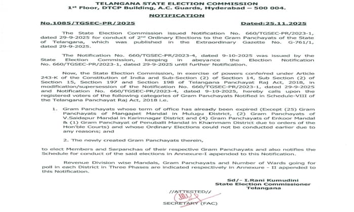 తెలంగాణ(Telangana) రాష్ట్రంలో గ్రామ పంచాయతీ ఎన్నికల (Gram Panchayat elections) షెడ్యూల్ (Schedule) విడుదలైంది. మూడు దశల్లో ఎన్నికలు నిర్వహించాలని నిర్ణయించారు. డిసెంబర్ 11న మొదటి దశ పోలింగ్ (polling), 14న రెండో దశ, 17న మూడో దశ పోలింగ్ ఉంటుంది. ఉదయం ఏడు గంటల నుంచి మధ్యాహ్నం ఒంటి గంట వరకు ఓటింగ్ (Voting) నిర్వహిస్తారు. మధ్యాహ్నం రెండు గంటల నుంచి ఓట్ల లెక్కింపు (Counting) ప్రారంభిస్తారు. సర్పంచ్, వార్డు సభ్యుల కోసం మాత్రమే ఎన్నికలు జరుగుతాయి.