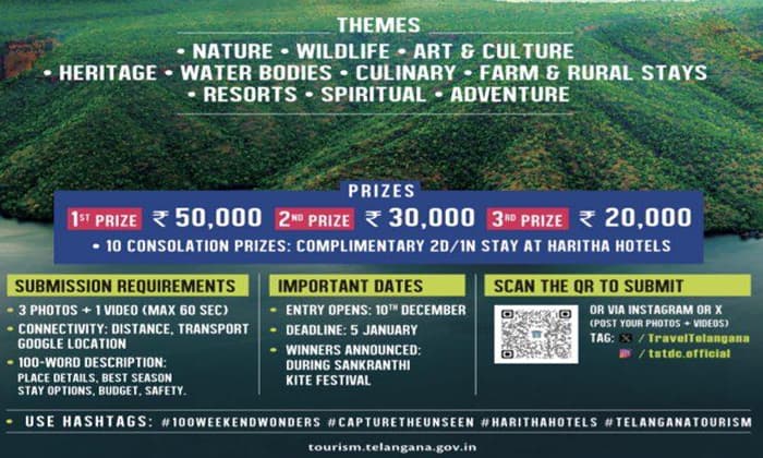 మొదటి బహుమతి రూ.50 వేలు, 2వ బహుమతి రూ.30 వేలు, 3వ బహుమతి రూ.20 వేలు ఇస్తారు. మరో 10 మంది విజేతలకు హరిత హోటల్స్‌లో 2 రోజులు/1 రాత్రి బస కల్పిస్తారు. థీమ్‌లు.. ప్రకృతి, వన్యప్రాణులు, వారసత్వం, సంస్కృతి, గ్రామీణ బసలు, ఆహార మార్గాలు(ఫుడ్ ట్రయల్స్), నీటి వనరులు, సాహస ప్రదేశాలు & మరిన్ని. ఎంట్రీలను 2026 జనవరి 5లోపు పంపాలి. తెలంగాణలో వారాంతపు అనుకూల గమ్యస్థానాన్ని హైలైట్ చేసేలా 3 ఫోటోలు + 1 వీడియో సమర్పించాలి.