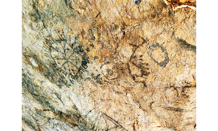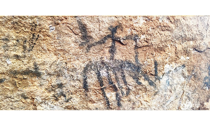 గుర్తించడానికి వీలుపడని ఒక పెద్ద జంతువు, చిన్న సరీసౄపం, రెండు గీతలు క్రాస్ అయి ఉండటం, పొడవైన కొమ్మువంటి, ఎముకలవంటి ఆకారాలు, మసకబారిన త్రిభుజాలు, అనిశ్చిత డిజైన్లు, ఇతర గీతలు, మానవ ఆకృతి?ఇవన్నీ మెసోలిథిక్ కాలానికి చెందిన రాతిచిత్రాలు. ఎరుపు రంగు గీతలు కొన్నిసార్లు ఒకదాని పై ఒకటి అధ్యారోపణం(super imposition) చేయబడి ఉంటాయి.